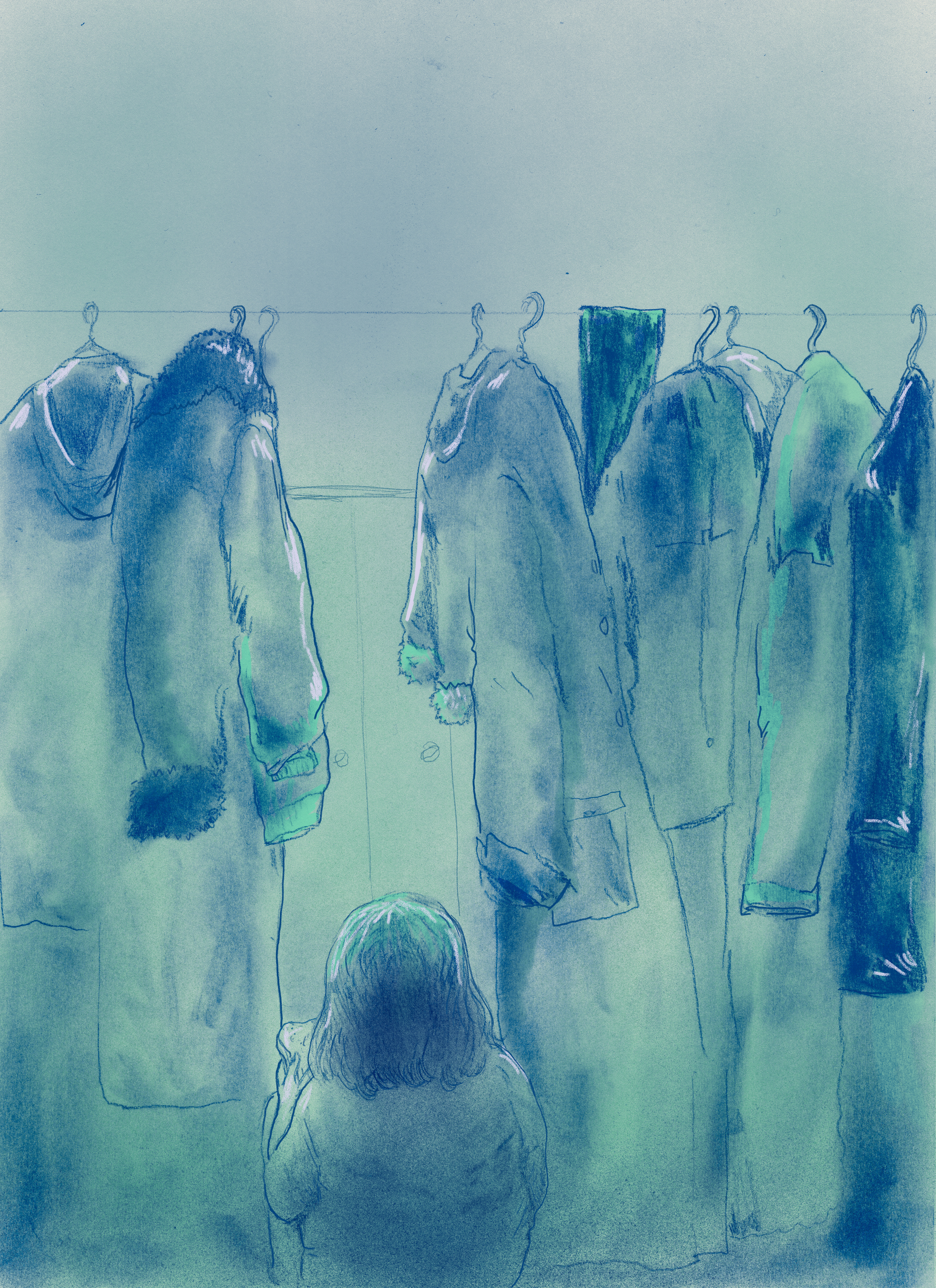 Two illustrations about the bullying a young girl endured in school, and the lasting effects it had on her.