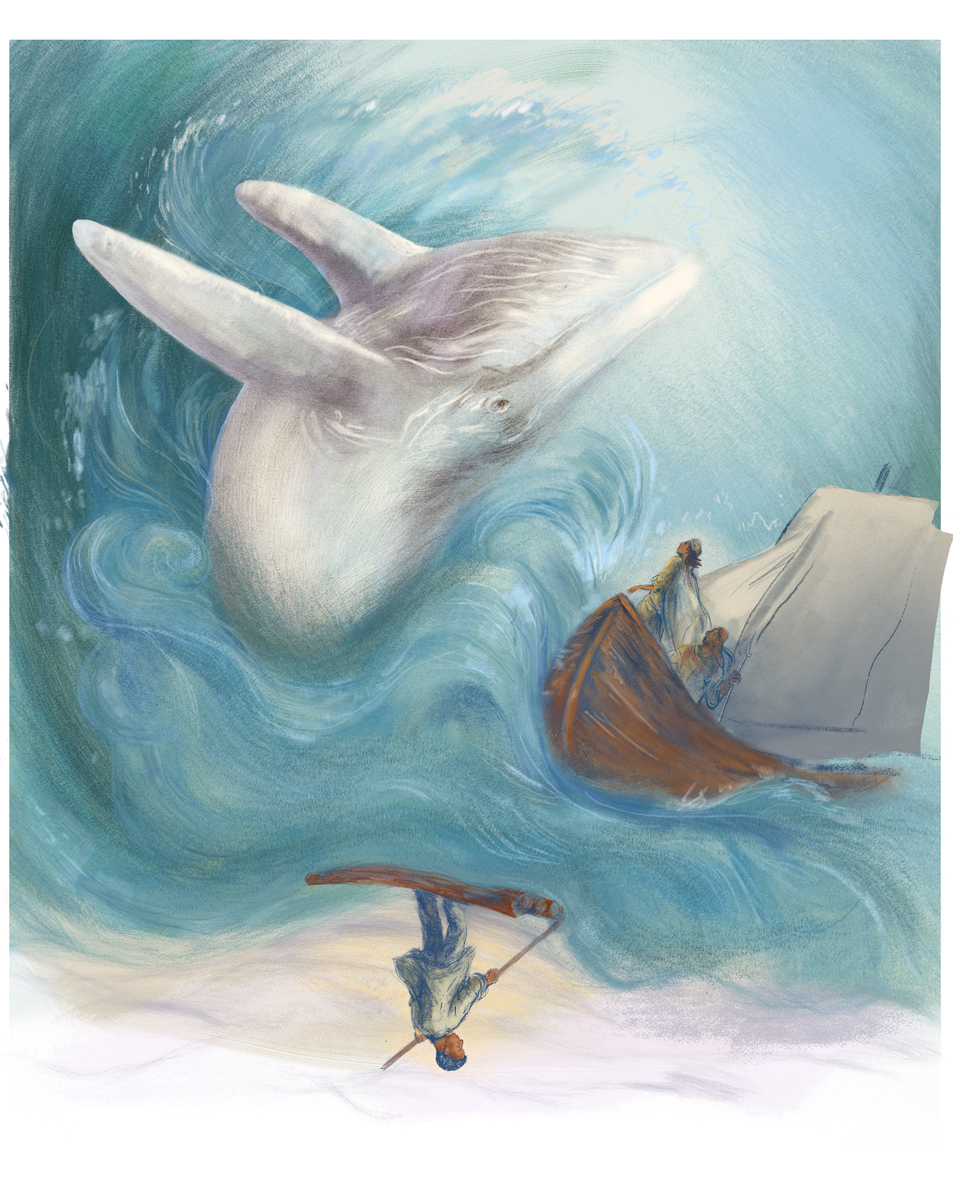 Illustration for newspaper NRC, about retelling classic stories like Moby Dick from a different perspective.