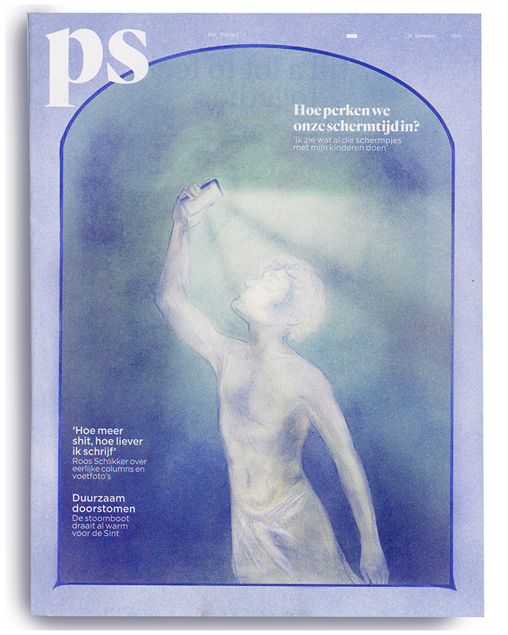 Cover for the PS magazine that's included with newspaper Parool, about too much screentime.
